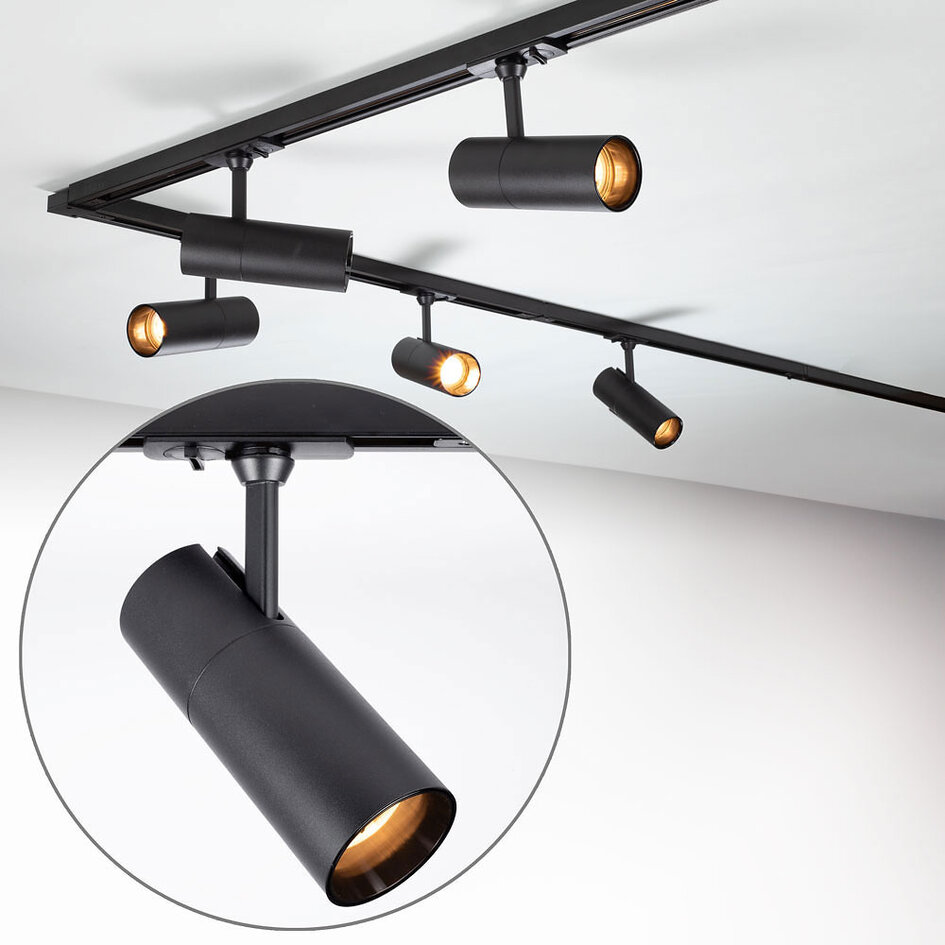 I pakken finder du 4 aluminiumsskinner á 75 cm med en mat, sort belægning. 1 af skinnerne er inkl. tilslutningsblok. Skinnerne kommer med 3 x I-koblingsstykker, 1 x L-koblingsstykke, skruer samt tilhørende endestykker. Du kan selv vælge, hvor mange skinnespots du ønsker, der skal være på skinnen.
