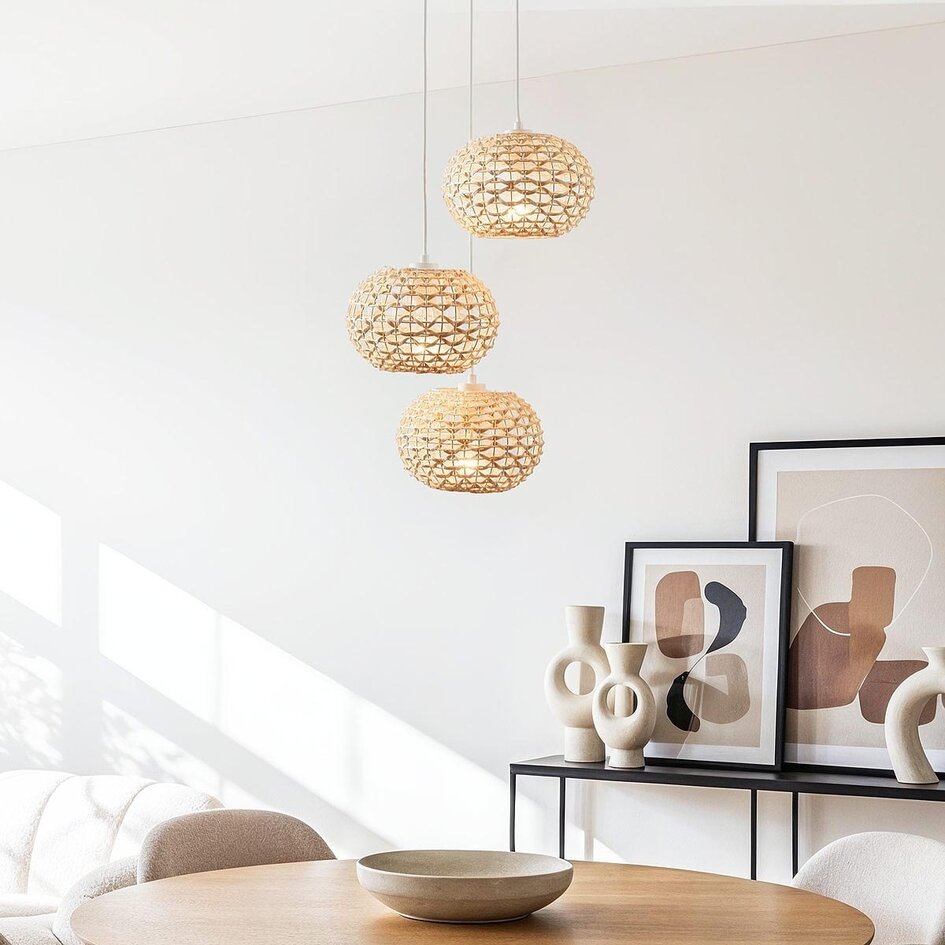 Tilføj varme, tekstur og et legende element til din indretning med pendellampen Canaba. Lampen består af tre håndflettede lampeskærme i lys rattan, som hænger i forskellige højder (maks. længde 150 cm). Den åbne flettede struktur lader lyset filtrere blidt gennem materialet og giver en dekorativ og behagelig belysning. Canaba passer perfekt over et rundt spisebord, i en entré med højt til loftet eller som et stilfuldt blikfang i stuen.