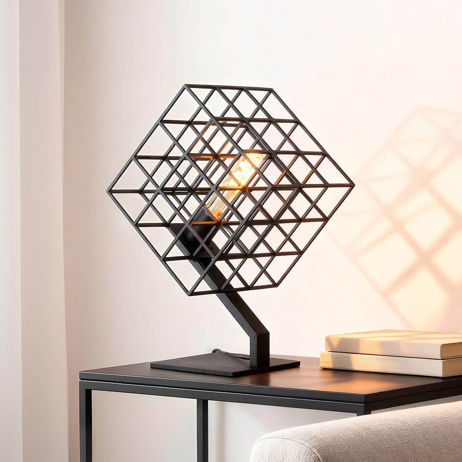 Piazza er en raffineret og moderne bordlampe, der vækker opmærksomhed. Det innovative design består af et firkantet net i kubeform og er nærmest en kunstgenstand i sig selv. Samtidig skaber den åbne struktur og den synlige pære en smuk lysfordeling. Lampens sorte finish er på samme tid robust og chik, hvilket får bordlampen til at passe ind i forskellige interiørstile. Brug bordlampen som dekorativ belysningsgenstand på en kommode eller reol i både hjemmet eller på kontoret.