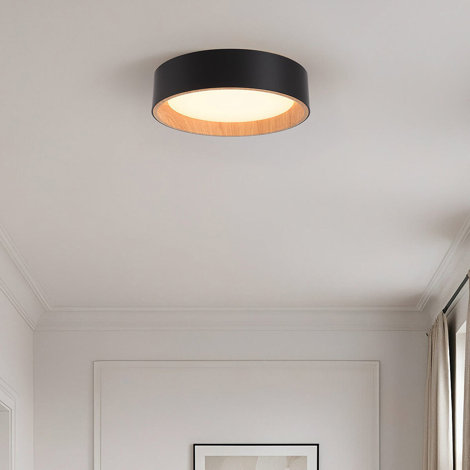 Giv dit interiør et stilfuldt look med loftslampe Larios. Denne designlampe kombinerer et slankt sort metalstel med et subtilt trælook på indersiden. Den matte diffusor sikrer en blød og jævn lysfordeling. Takket være den integrerede 16W LED kan du nyde varmhvidt lys (2700K). Med den praktiske 3-trins dæmpningsfunktion via vægkontakten og hukommelsesfunktionen kan du nemt tilpasse lysintensiteten til enhver lejlighed. Med sin kompakte størrelse på Ø29 cm er Larios ideel til entreen, soveværelset, køkkenet eller stuen.