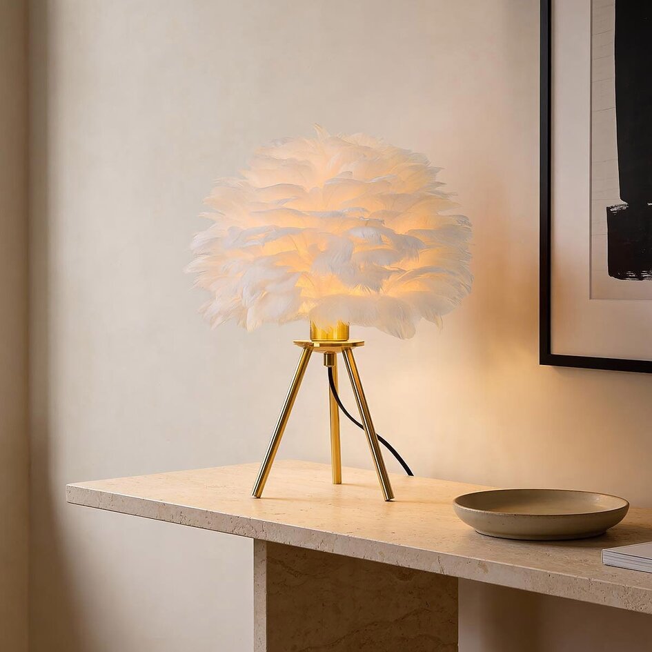 Bordlampen Saphira er et raffineret blikfang, der forener blød elegance og luksus. Den fyldige skærm med hvide fjer skaber et let og skyagtigt udtryk og filtrerer lyset på en behagelig måde. Sammen med de tre slanke ben i guldfarvet messing opstår der en elegant kontrast, som giver lampen et moderne og stilfuldt udtryk. Saphira tager sig smukt ud på en skænk, et nat- eller sidebord og passer perfekt ind i rolige, luksuriøse, moderne og romantiske indretninger.