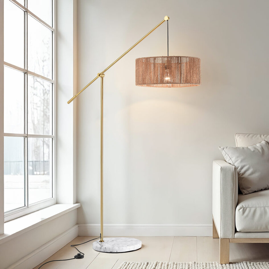 Tilføj et stemningsfuldt og funktionelt element til din indretning med denne gulvlampe. Med den justerbare arm kan du selv bestemme, hvor lyset skal skinne. Gulvlampen kommer med en stilfuld, flettet lampeskærm og et messingarmatur i vintagestil. Den flettede lampeskærm lader lyset filtrere blidt gennem materialet og skaber en varm og indbydende atmosfære. På den måde kan du nemt skabe en hyggelig stemning i stuen eller indrette et behageligt læsehjørne.