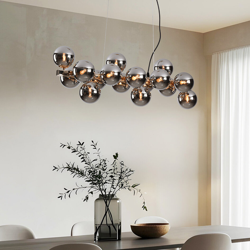 Langbordspendlen måler 76 cm lang, 24 cm bred og 120 cm høj. De anvendte materialer er jern og glas. Hængelampen bruger 16 LED-pærer af typen G9, som maksimalt må være på 40 watt stykket. Bemærk venligst, at lyskilderne ikke følger med, og at du derfor skal bestille disse separat. Vælger du at montere dæmpbare G9-pærer i loftslampen, kan lyset dæmpes ved hjælp af en ekstern lysdæmper. Du kan tage et kig på vores udvalg af lysdæmpere her.