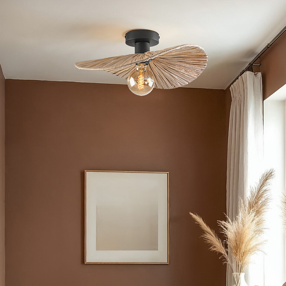 Med denne unikke Loftlamper Satu skaber du en naturlig og stilfuld atmosfære i dit interiør. Lampen kombinerer en slank sort metalramme med en håndlavet lampeskærm af flettet raffiapapir. Raffia, der stammer fra bladene på raffiapalmen, forarbejdes til alsidige fibre, der passer til forskellige boligstilarter. Uanset om du har et moderne, minimalistisk eller boho-chic interiør, tilføjer denne lampe en varm og autentisk karakter til ethvert rum.
