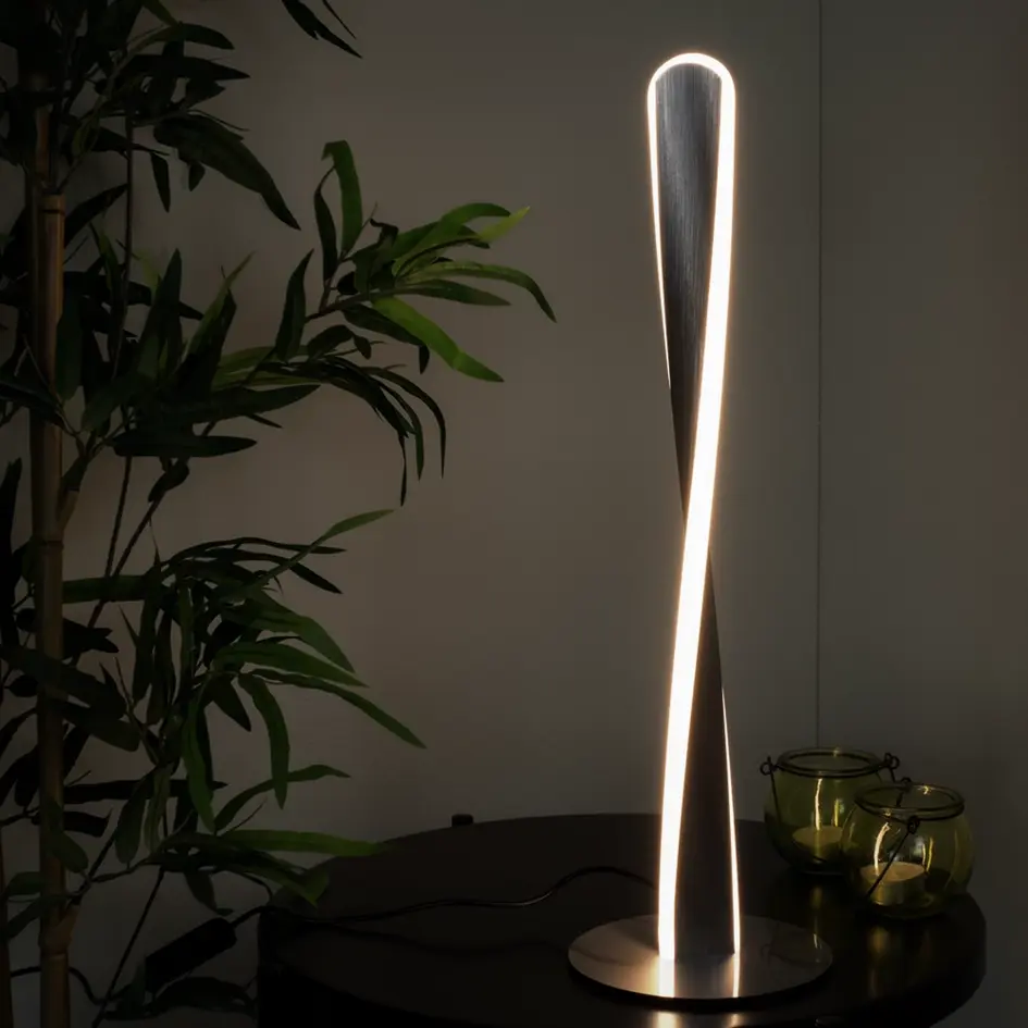 Rizar er en spændende, moderne bordlampe med en let snoet form. Kombinationen af det slanke armatur og den unikke form giver denne bordlampe et subtilt, men solidt look, og den passer derfor ind i næsten ethvert moderne interiør. Lampens integrerede LED-lysslanger er placeret på ydersiden af lampen og følger basens snoede form. Derudover er bordlampen udstyret med en lysdæmper, så du via kontakten kan justere lysstyrken efter ønske. Brug Rizar som læselampe eller som stemningsskabende element i et hjørne af boligen.