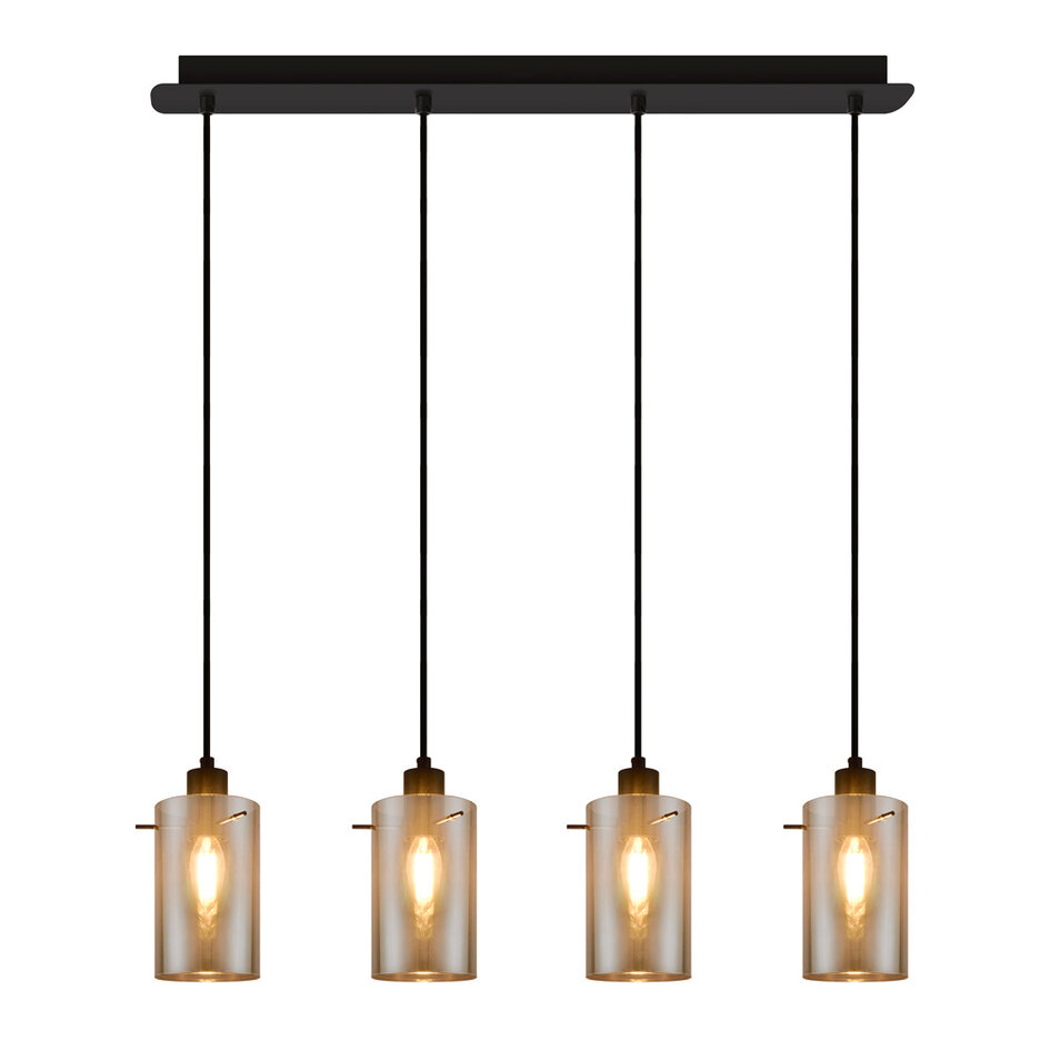 Worth er en smuk pendellampe i en moderne stil med fire cylindriske lampeskærme, der er fastgjort til fire slanke fatninger. Lampeskærmene er udført i gråt glas (også kaldet "smoke" glas), hvilket skaber et spændende udtryk. Glasset er en smule transparent, og du kan derfor ane lyskilderne gennem glasset. Samtidig står det grå glas flot sammen med de sorte ledninger og det aflange loftbeslag, der holder lampen oppe. Denne pendellampe er den perfekte belysningsløsning over ethvert spisebord eller aflange områder såsom en køkkenbar eller køkkenø.