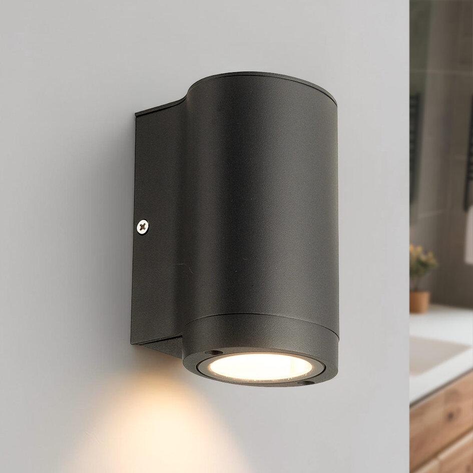 Denne moderne væglampe med et robust, cylindrisk hus er velegnet til både funktionel og stemningsfuld belysning i badeværelset. Det fokuserede lys skinner nedad og giver en klar belysning, for eksempel ved siden af spejlet eller ved håndvasken. Det sorte aluminium design giver lampen et robust, minimalistisk udseende. Takket være IP44-beskyttelsesgraden er denne væglampe ideel til fugtige rum.
