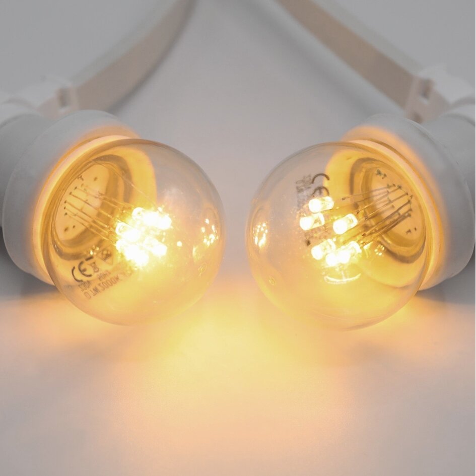 Dette lyskæde-sæt kommer med varmhvide LED-pærer på 0,7 watt og er produceret med LED-dioder på lange pinde. De lange lyspinde ses tydeligt gennem den robuste plastikkugle, og gør ikke kun pærerne pæne at se på, men giver dem også et flot lys. Samtidig kan du nyde godt af den moderne LED-teknologi, der både sørger for et lavere energiforbrug og en lang levetid.