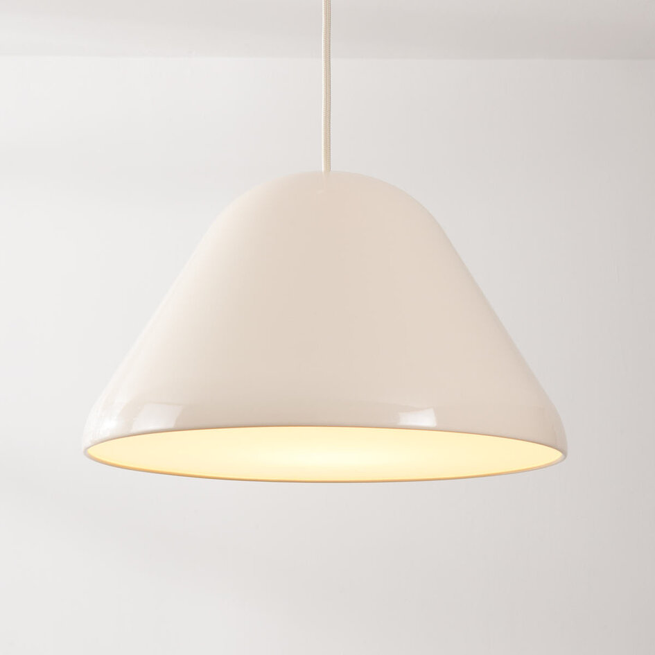 Calyx er en moderne, retroinspireret pendellampe med en blank beige finish. Den beroligende farve tilfører en helt særlig varme og ro til indretningen. Lampens brede skærm sikrer en effektiv og behagelig lysspredning, mens den hvide inderside reflekterer lyset klart og jævnt. Den beige tekstilledning fuldender det slanke og stilrene udtryk. Hæng Calyx over spisebordet, i køkkenet eller i stuen for at skabe en rolig og nostalgisk stemning.