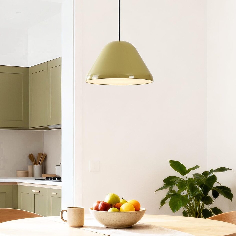 Calyx er en moderne, retroinspireret pendellampe med en blank khakigrøn finish. Den beroligende farve tilfører en helt særlig varme og ro til indretningen. Lampens brede skærm sikrer en effektiv og behagelig lysspredning, mens den hvide inderside reflekterer lyset klart og jævnt. Den sorte tekstilledning fuldender det slanke og stilrene udtryk. Hæng Calyx over spisebordet, i køkkenet eller i stuen for at skabe en rolig og nostalgisk stemning.