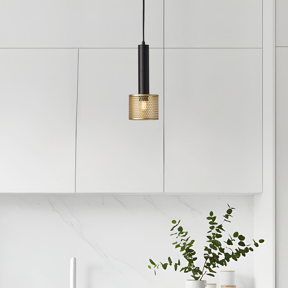 Pendellampen Ouro kommer med et legende design med et retro look. Lampen består af et enkelt lyspunkt med en metalskærm med hulmønster. Lyskilden skjules af en glascylinder, som gemmer sig under gulskærmen og sørger for at lampen udsender et blødt og hyggeligt lys. Den sorte base kombineret med guldskærmen giver et varmt og luksuriøst look til din indretning. Lampen gør sig godt som dekorativ hyggebelysning, f.eks. over et mindre spisebord eller i hjørnet af stuen.