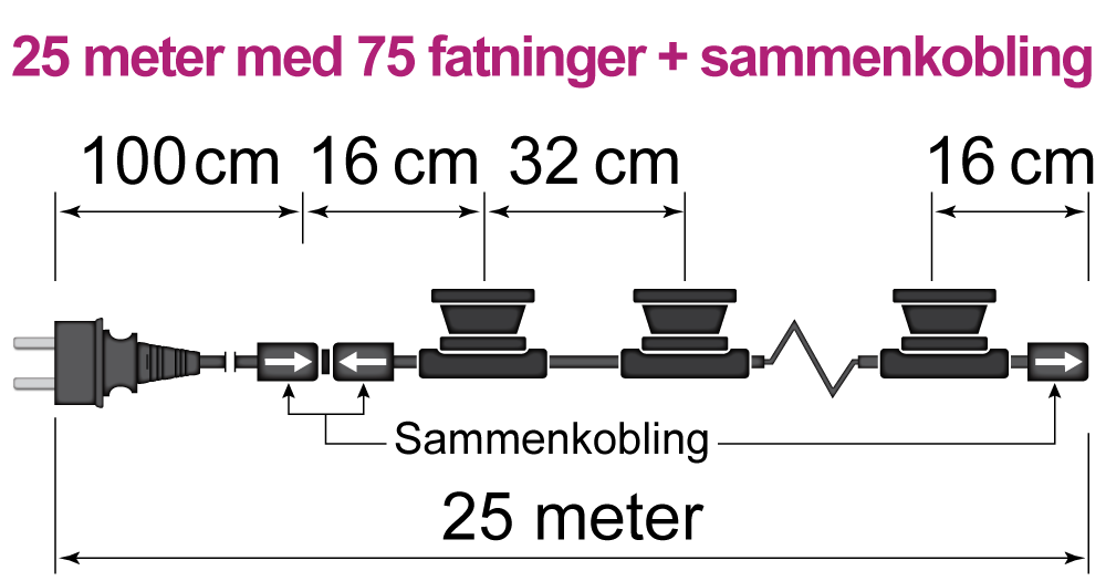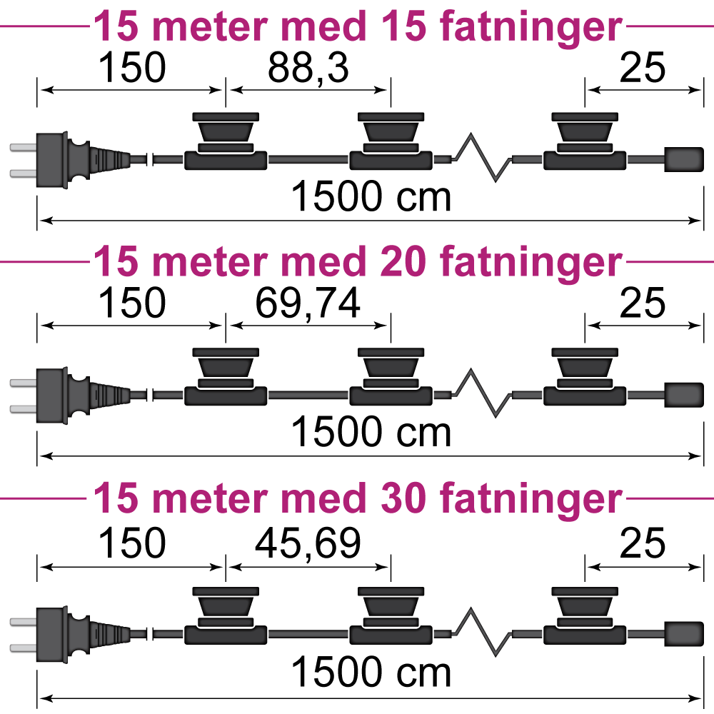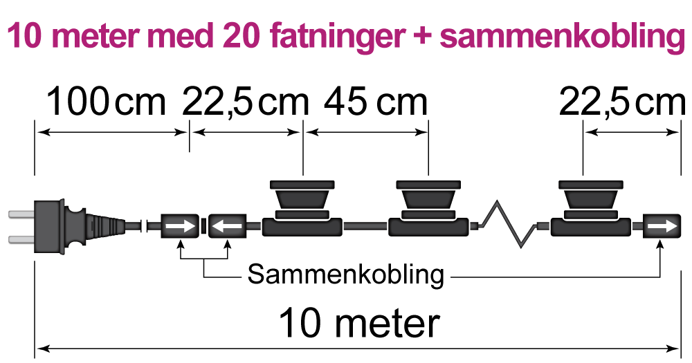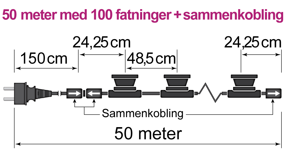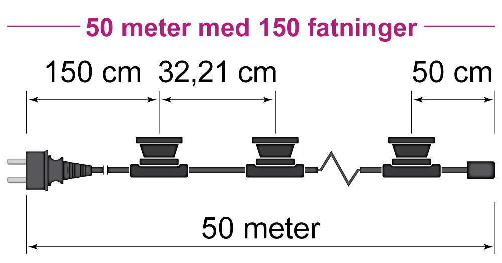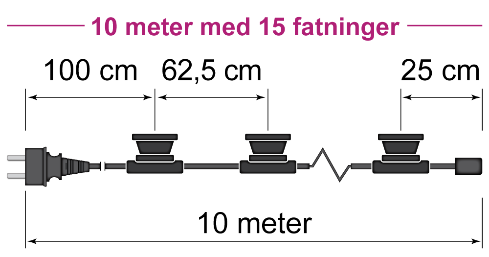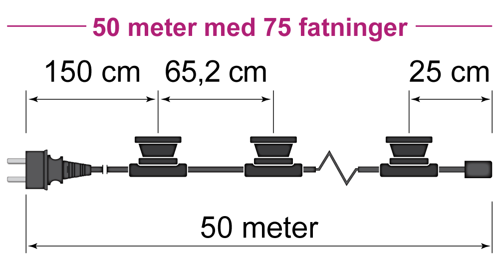 På denne side finder du specifikationer og produktmål af vores lyskæder. Dimensionstegningerne er sorteret efter lyskædernes længde. Øverst finder du dimensionstegningen af lyskæden på 5 meter, og hvis du scroller helt ned, finder du dimensionstegningen af vores lyskæder på 100 meter.