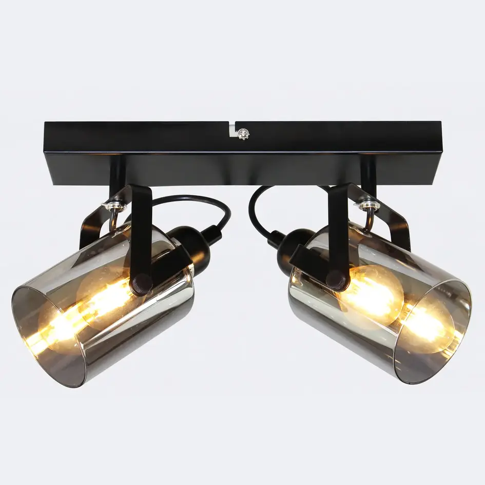 Loftslampen Ryan har to justerbare spotlamper med røgfarvede glasskærme og er en lampe, der både pynter og er funktionel. Lampens minimalistiske jernbase og beslag garanterer mange års holdbarhed og stabilitet. Spotlamperne har et industrielt look og er udført i røgfarvet glas. Denne type glas giver et blødt og diffust lys, der skaber en hyggelig og afslappende stemning. Takket være de to lyskilder kan du tilpasse belysningen til dine behov, hvad enten du ønsker stemningsbelysning eller et mere praktisk lys. Montér f.eks. Ryan i entréen, i en fordelingsgang eller i køkkenet.