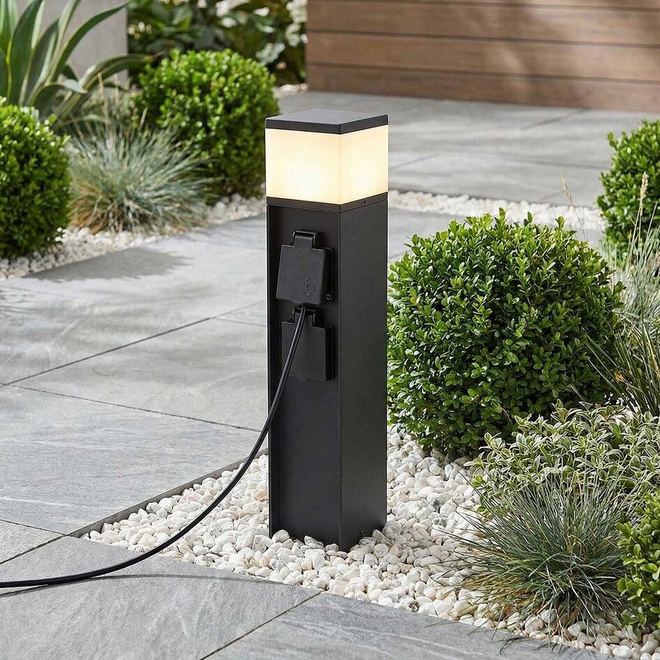 Ute er en stående udendørslampe med stikkontakt, der kombinerer lys og funktionalitet i et elegant design. Med den indbyggede E27-fatning (lyskilde medfølger ikke) kan du selv vælge den ønskede lyskilde – fra varmt stemningslys til klart funktionelt lys. Derudover har Ute to integrerede stikkontakter, der er velegnede til tilslutning af havebelysning, elværktøj eller andet udendørsudstyr.