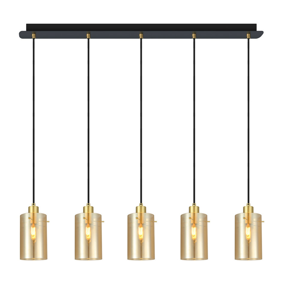 Den stilfulde pendellampe Seattle har fem cylindriske lampeskærme, som er fastgjort til fem slanke fatninger. De fem lampeskærme i gyldent glas giver et varmt og harmonisk udtryk og står i flot kontrast til lampens sorte ledninger og smalle, sorte loftbeslag. Denne lampe passer perfekt over et spisebord eller langs en køkkenbar, køkkenø eller lignende.