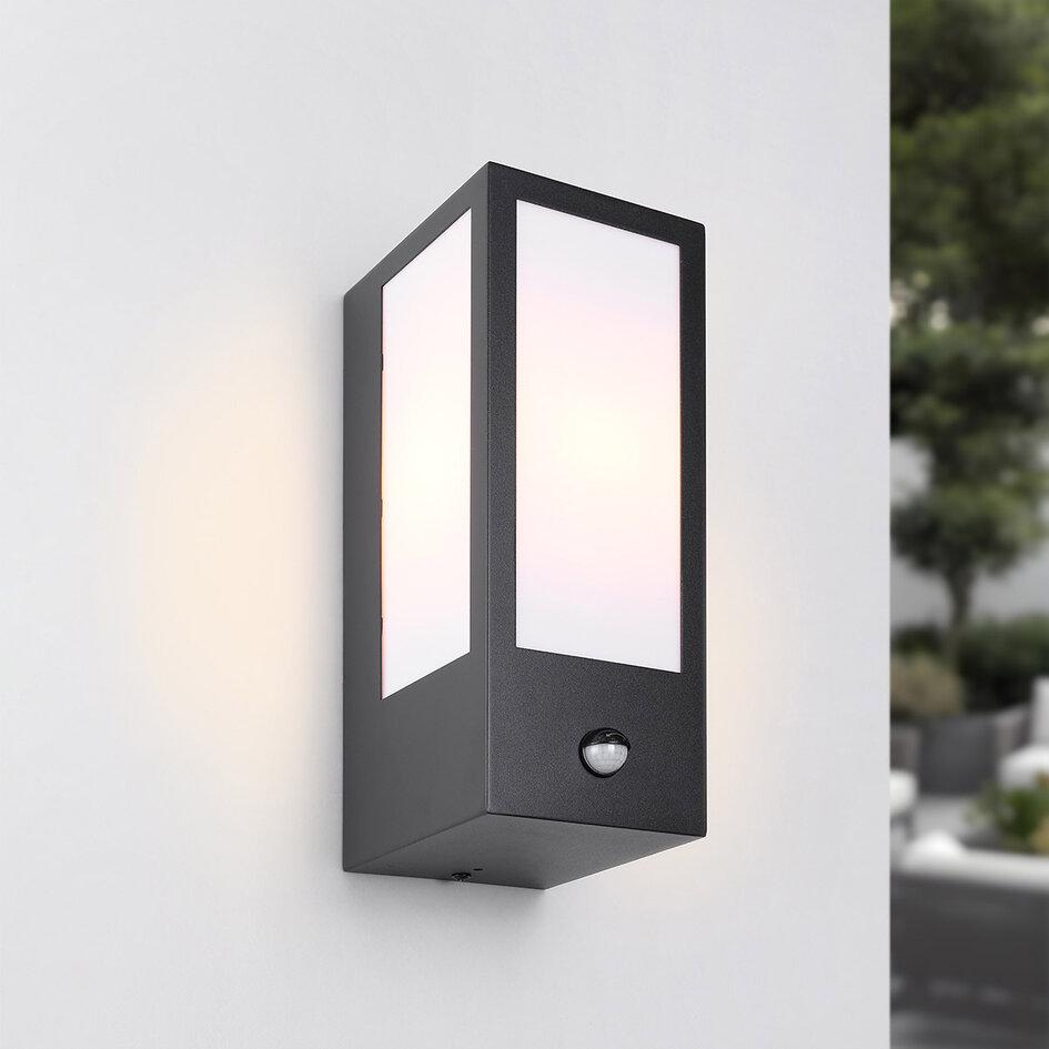 Væglampen Lyon er udviklet til både at sprede stemning og til at skabe trygge omgivelser omkring din bolig. Lampen er designet med et slankt, rektangulært metalhus med mælkehvide plastpaneler og passer flot ind ved siden af hoveddøren. Derudover er den udendørs væglampe udstyret med en bevægelsessensor, der sørger for automatisk at tænde og slukke lyset.