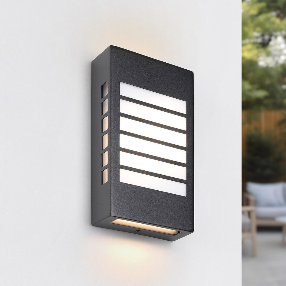 Væglampen Pearlie formår at efterlade et yderst positivt førstehåndsindtryk. Dette skyldes ikke kun dens elegante og moderne udseende, men også dens funktionelle karakter. Pearlie har en sort aluminiumsbase og seks horisontale, mælkehvide lyspaneler langs armaturets front. Lampen kommer med en indbygget LED-lyskilde, der giver et varmhvidt lys, og som er med til at skabe en hyggelig stemning udendørs.
