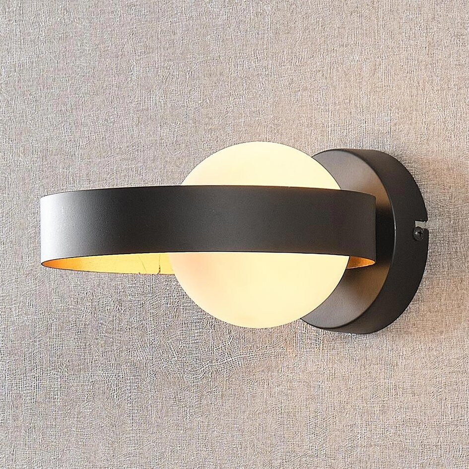 Den elegante væglampe Carlos er designet med en opalhvid glaskugle, omkranset af en sort metalring med bladguld på indersiden. De tre forskellige farver og overflader giver væglampen et luksuriøst udseende, der tager din indretning til et højere niveau.